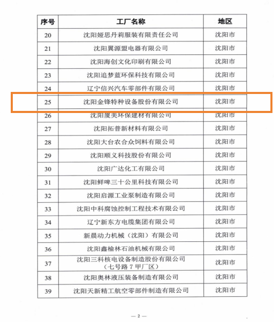 2025年10月16日,辽宁省工业和信息化厅公布省级绿色工厂名单,沈阳金锋特种设备股份有限公司(以下简称“公司”)成功入选(位列25),荣获“省级绿色工厂”称号。